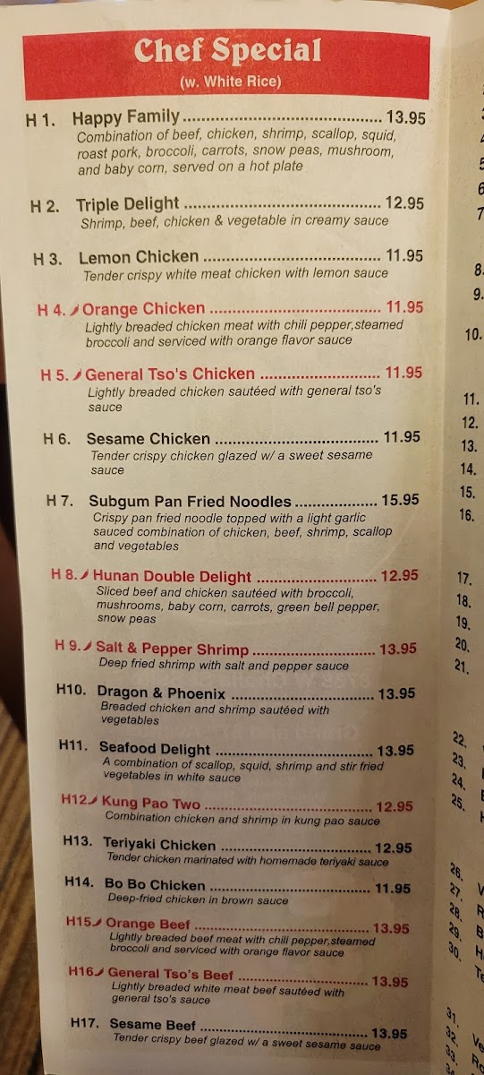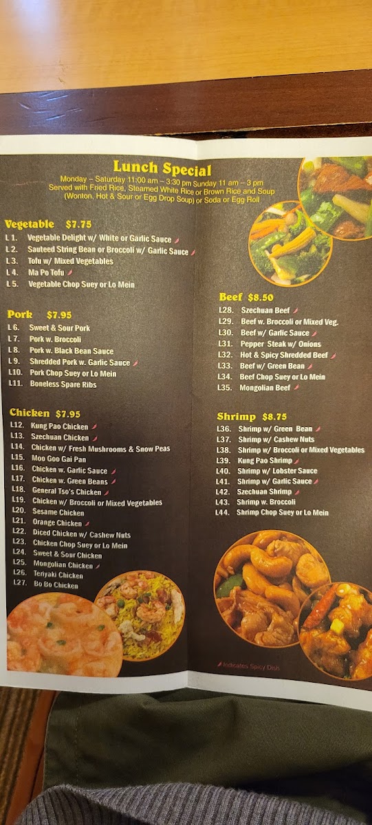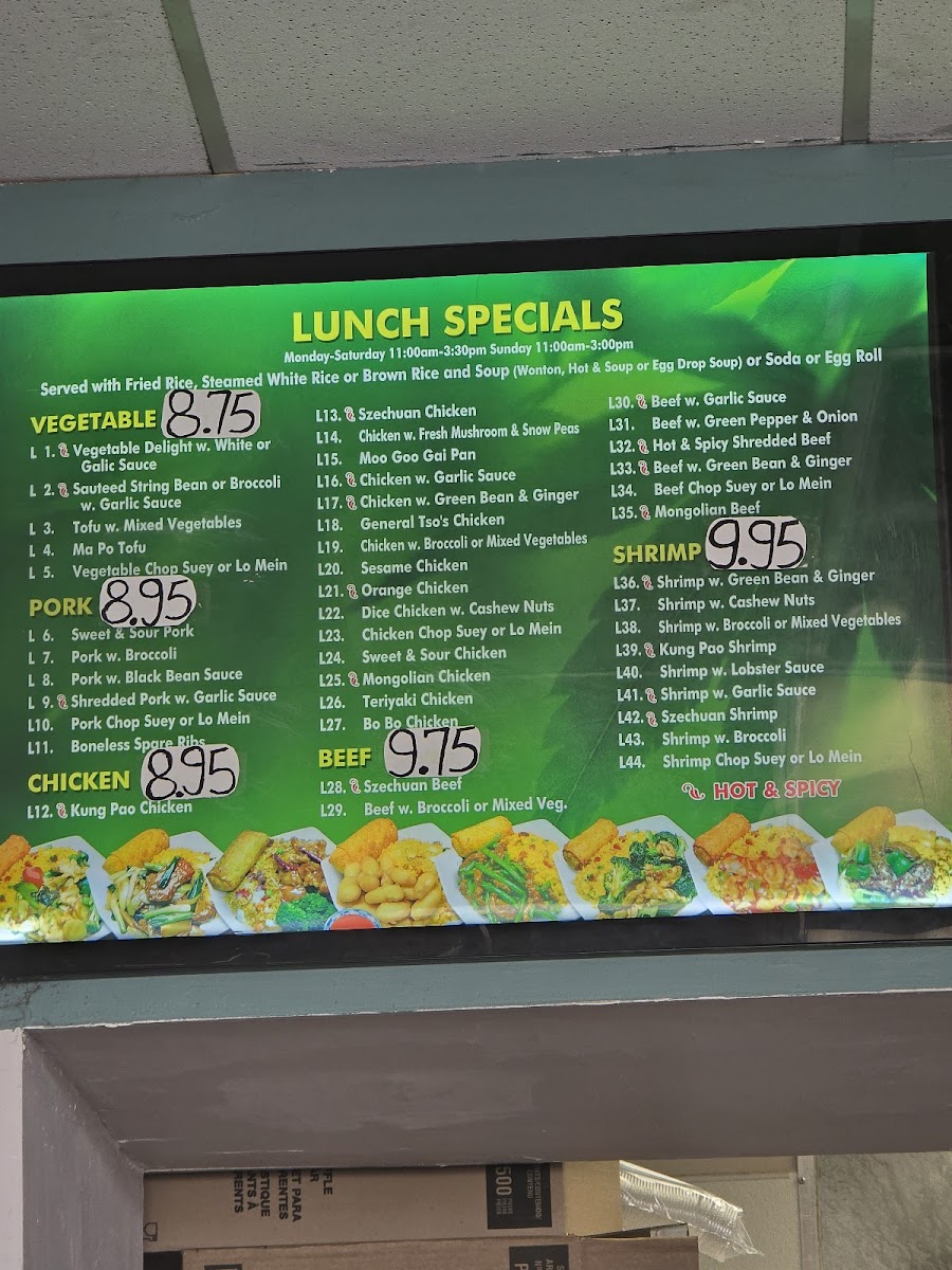 The menu offers something for everyone, including a dedicated diet section with options like Broccoli in Garlic Sauce and Triple Jade, showcasing fresh vegetables sautéed to perfection. For those craving traditional Chinese classics, the Chop Suey varieties—like Beef and Shrimp—are a must-try, with generous portions that promise satisfaction.